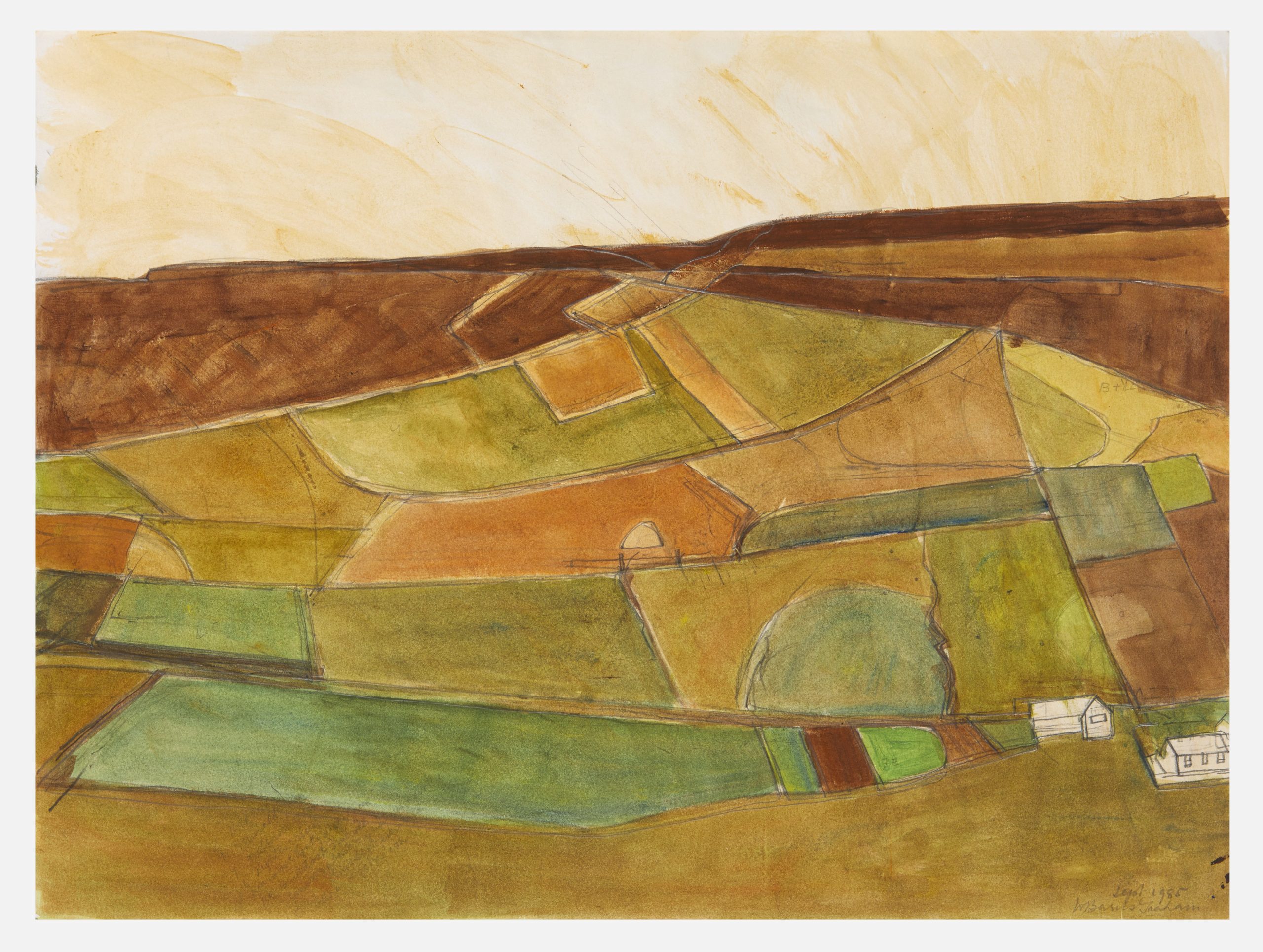While she continued to work on her Orkney-inspired series of works through 1985, 1986, and 1987, several works were begun during her 1985 stay in Orkney, including sketches, collages, or taking photographs of Orkney for later reference. Barns-Graham additionally spent time knitting her series of abstract design ties during this trip.