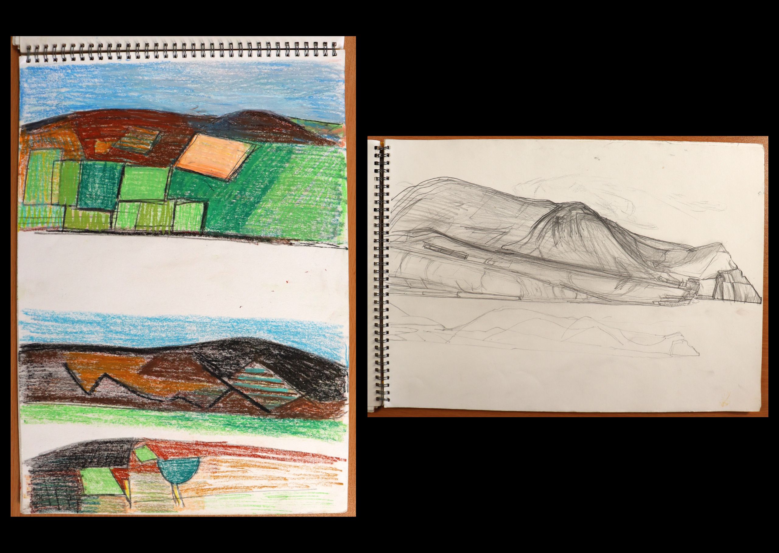 …huge dramatic fascinating structures of cliffs in ridges + incredible menacing enticing atmosphere.. it so reminded me of my pc. of glacier shelf – it was all in lines – so very glad I went + lots to draw but I was also very alarmed + frightened…