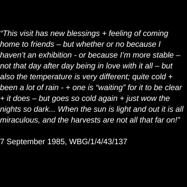 Barns-Graham buys a new camera, as she says the photographs from her previous one were “disappointing as so small + square when everything feels long” (21 August 1984 Diary; WBG/4/1/42/129).