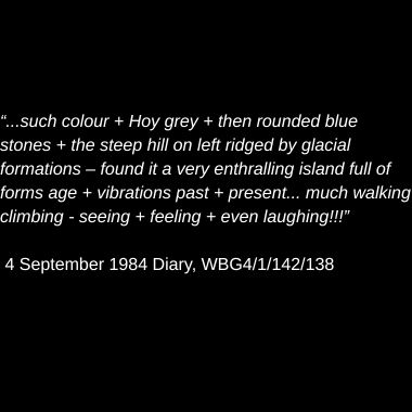 While staying in Stromness, Barns-Graham frequently took long walks and went on several coastal drives, often visiting Ness Point, Warebeth Beach, and the Kirkyard cemetery in Stromness. She additionally took several small trips to Kirkwall, Finstown, and Stenness.
